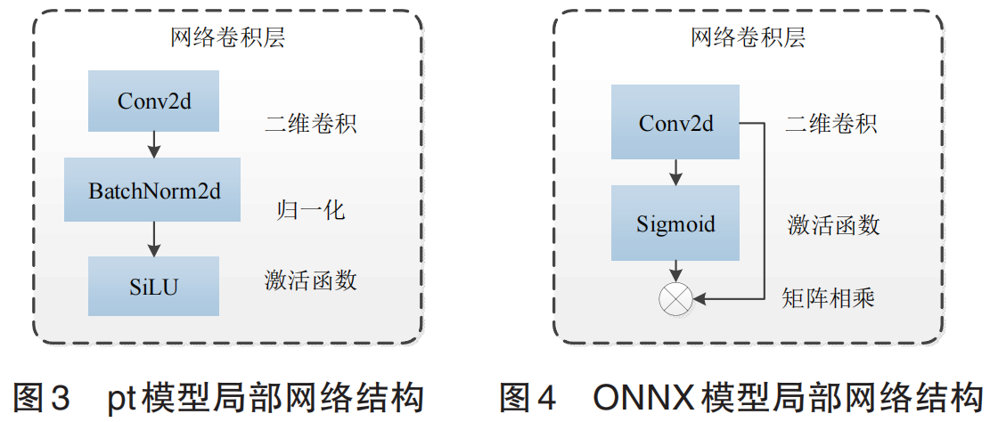 检测算法中的一些函数结构对于边缘计算设备(特别是需要量化操作的 NPU 芯片)来说,在速度和精度上的影响显著。其中,卷积之后的激活操作采用的 SiLU 函数,在 NPU 上的效率不高,且会在转换时被 ONNX 拆分,对检测结果的稳定性和可靠性有较大影响。因此,在转换为 ONNX 模型时,主要针对图5的 sigmod + mul 组合,将 hardSwish 模块合并,提升在 NPU 上的运行效率。